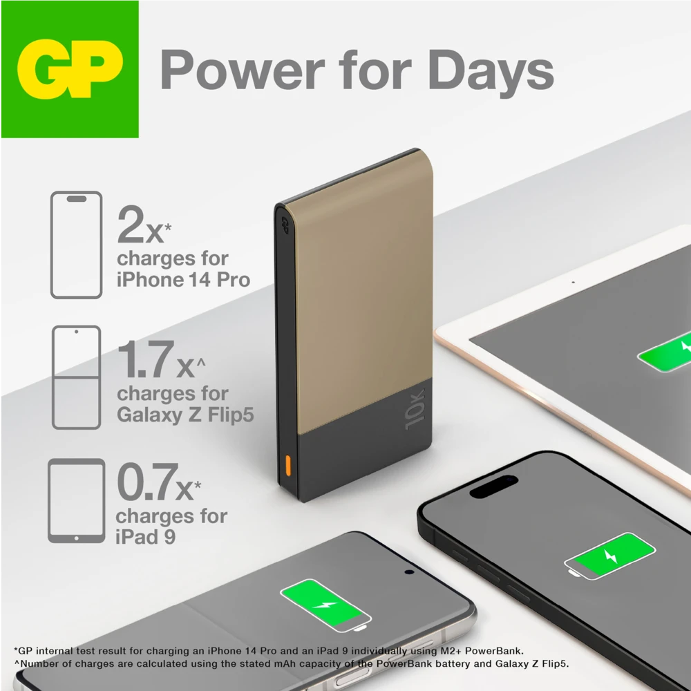 Gardez vos appareils alimentés toute la journée, peu importe ce que vous faites. Recharge complètement un iPhone 14 Pro deux fois*, ou des appareils à faible consommation tels que des écouteurs et des montres intelligentes plusieurs fois. Laissez M2+ vous accompagner au quotidien.