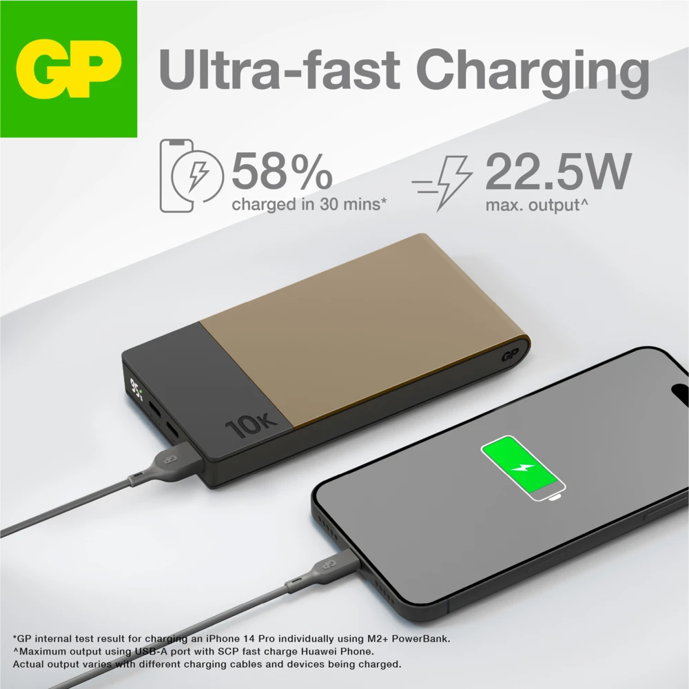 *Résultat du test interne GP de la recharge d'un iPhone 14 Pro individuellement à l'aide de la batterie externe M2+.