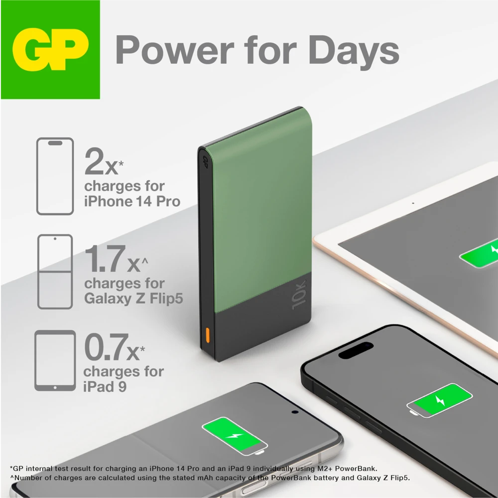 Gardez vos appareils alimentés toute la journée, peu importe ce que vous faites. Recharge complètement un iPhone 14 Pro deux fois*, ou des appareils à faible consommation tels que des écouteurs et des montres intelligentes plusieurs fois. Laissez M2+ vous accompagner au quotidien.
