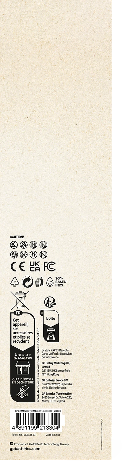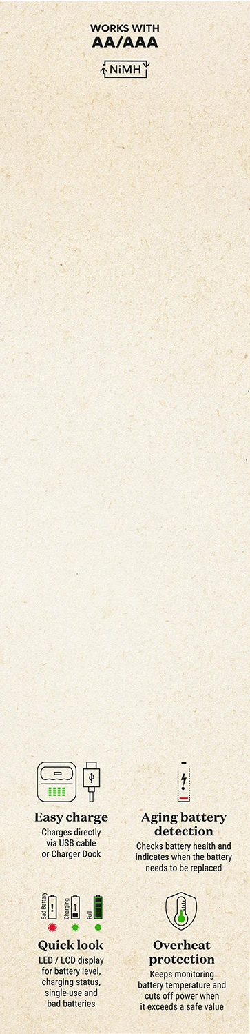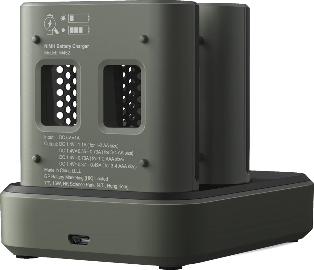 Le M452 met plus de 2 heures pour charger complètement deux batteries, ou 4+ heures pour charger complètement quatre batteries (piles AA 2600mAh) via une connexion USB. Les voyants LED bicolores indiquent l'état de charge ainsi que si des piles à usage unique ou défectueuses sont insérées. Un autre détail de sécurité est la minuterie de coupure automatique de l'alimentation et la détection de charge complète -dv, qui vous aident à éviter les surcharges, les surtensions et les courts-circuits, ainsi qu'à prévenir les dommages à la durée de vie de la batterie.