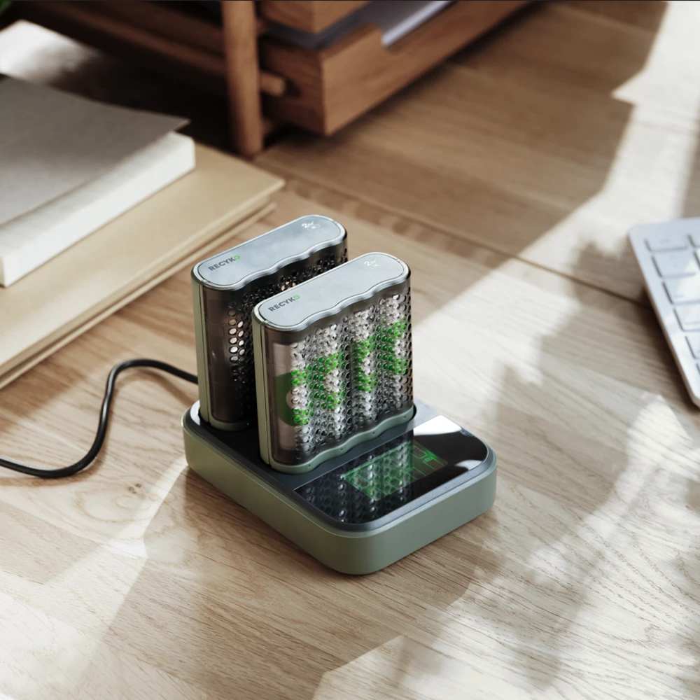 La conception unique et peu encombrante du D851 peut contenir jusqu'à deux chargeurs de batterie Recyko verticalement (chargeant jusqu'à huit batteries à la fois) et est alimenté via une connexion USB, ce qui le rend idéal pour une utilisation à la maison et au bureau. Lorsque les chargeurs sont connectés, l'écran LCD sur la station d'accueil indique l'état de charge de chaque batterie ainsi que l'état de la batterie, vous rappelant quand remplacer les batteries anciennes.