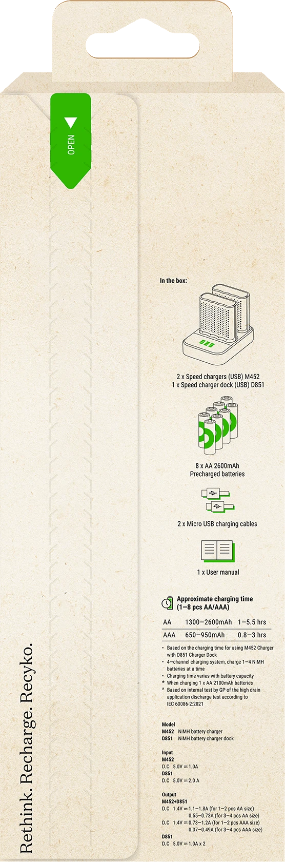 Chargeur GP Recyko 2x Speed M452 (USB) avec station de charge D851, incl. 8 piles AA 2600mAh NiMH