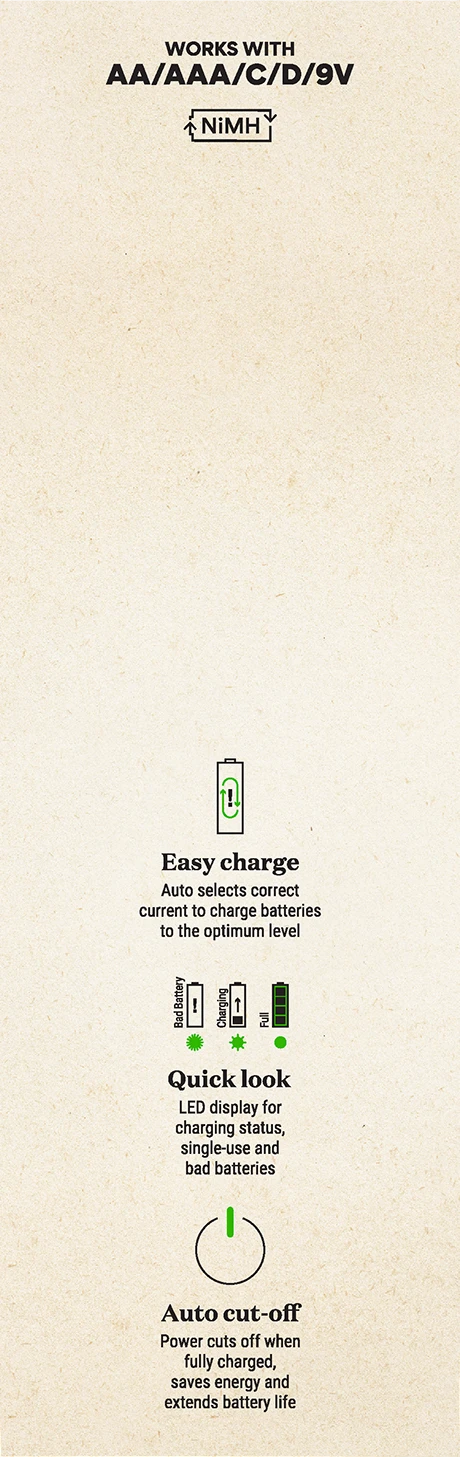 | Sortie | 2.8V for AA/AAA/C/D ; 9.8V for 9V NiMH Battery |