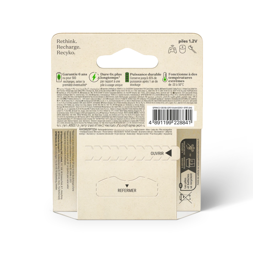 Une pile AA NiMH rechargeable aux propriétés respectueuses de l'environnement, mettant moins de stress sur l'environnement et votre portefeuille. Pré-chargé et prêt à l'emploi, il peut rester chargé jusqu'à 80% après 12 mois grâce à son faible taux d'autodécharge. Avec une température de fonctionnement allant de -20 ° C à +50 ° C, il offre des performances fiables même dans des environnements extrêmes. Composée de plus de 10% de matériaux recyclés, 94% + de l'ensemble de la batterie, y compris la boîte, peuvent également être recyclés.
