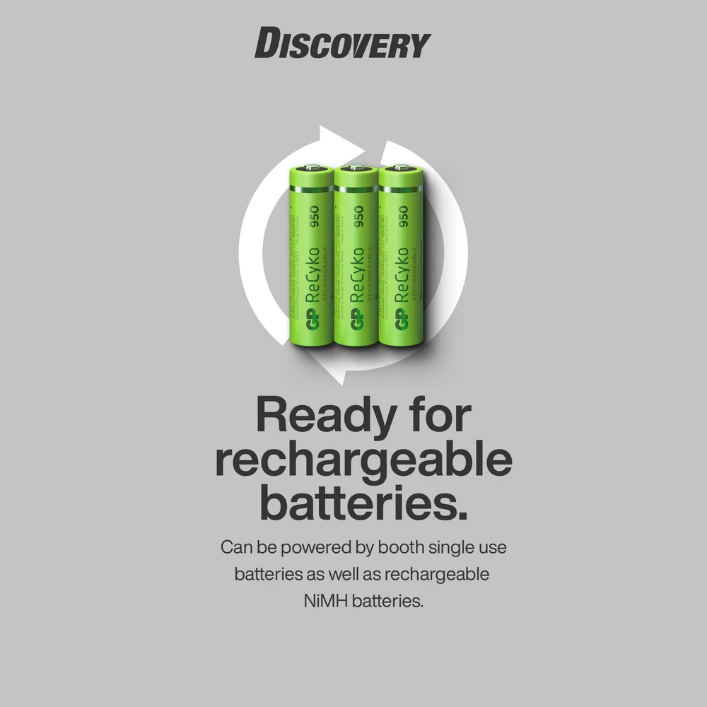Un choix plus écologique Cette lampe frontale est compatible avec les piles jetables et rechargeables (NiMH). Cette conception empêche les piles rechargeables de se décharger trop rapidement et utilise donc la totalité du cycle de vie des piles. Choisissez des piles rechargeables pour votre lampe frontale afin de réduire votre empreinte carbone et de contribuer à réduire les déchets provenant des piles jetables.