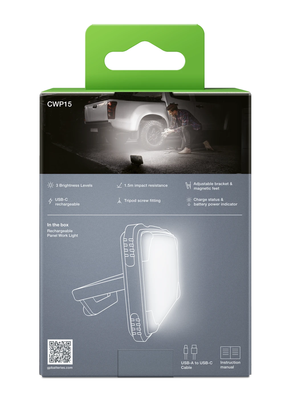 La lampe de travail GP Discovery Work CWP15 est la lampe qui vous permettra de ne plus jamais avoir à vous soucier d'un mauvais éclairage. Que vous vous épanouissiez dans la nature ou à la maison dans le garage, le GP Discovery Work CWP15 sera votre meilleur ami. Sa petite taille mais sa lumière puissante permettent des applications infinies. Ce panneau lumineux multifonctionnel est conçu pour fonctionner quelles que soient les conditions. Avec de multiples options de montage et trois niveaux de luminosité différents, il éclaire facilement les petites et grandes surfaces. Elle est très résistante à l'eau (norme IPX7) et sa conception robuste la protège des chocs et des chutes jusqu'à 1,5 mètre. Pour faire face aux longues heures de travail et aux aventures exigeantes, lampe de travail est équipé d'une puissante batterie rechargeable intégrée offrant une autonomie de 17,5 heures.
