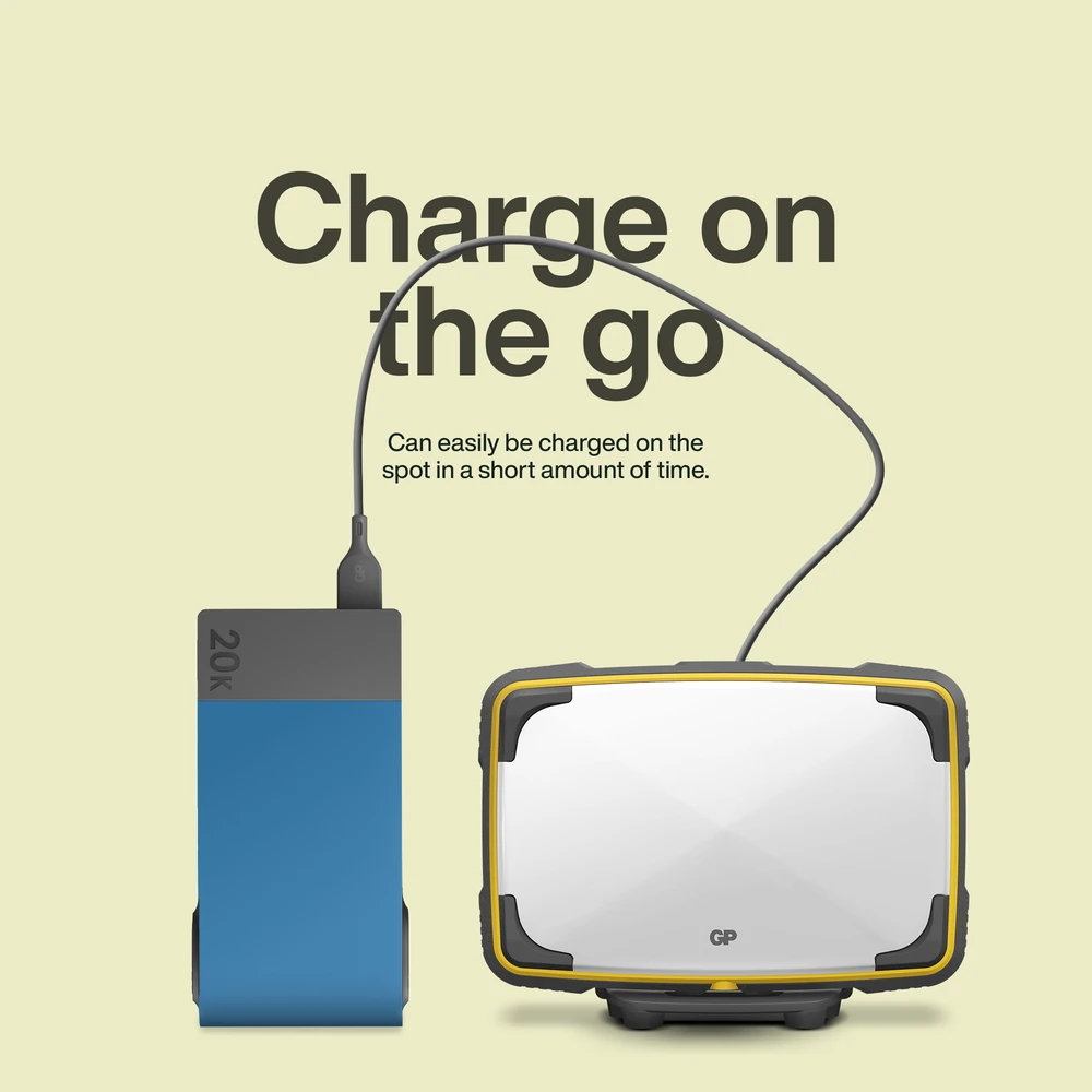 Toujours être chargé La lampe de travail est équipé d'une batterie lithium-ion rechargeable intégrée (5100 mAh) d'une autonomie pouvant atteindre 17,5 heures. La GP Discovery Work CWP15 est dotée d'un indicateur d'alimentation qui vous permet de savoir quand vous devez recharger votre lampe. Elle se charge avec l'USB-C (câble inclus) et peut rester en mode de lumière la plus faible pendant la charge, offrant ainsi une autonomie infinie. Soit sans fil en combinaison avec une powerbank, soit directement branchée sur une prise de courant.