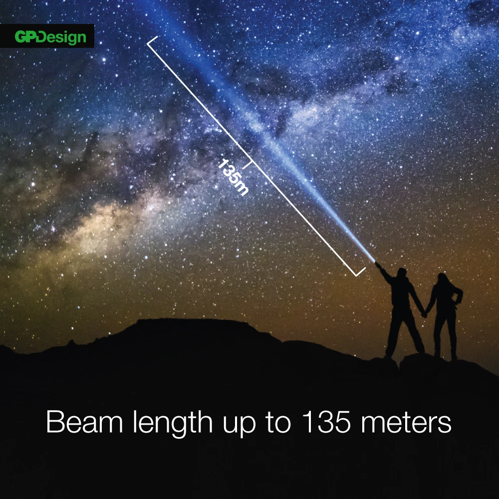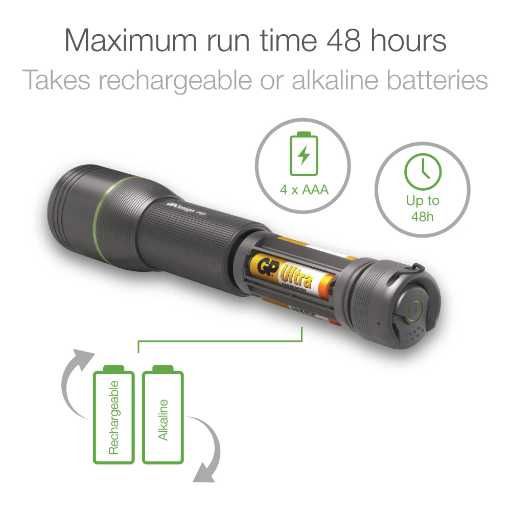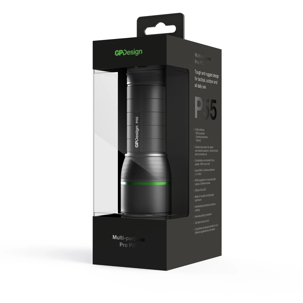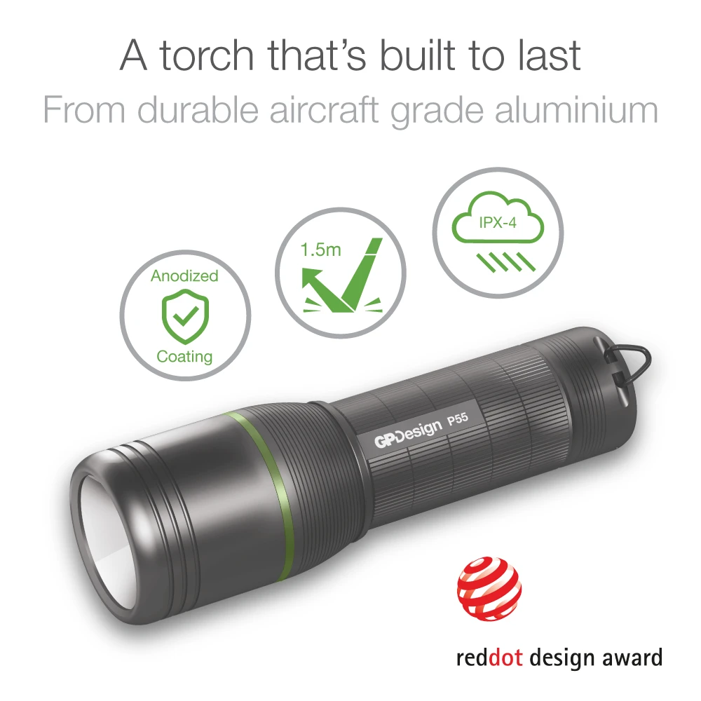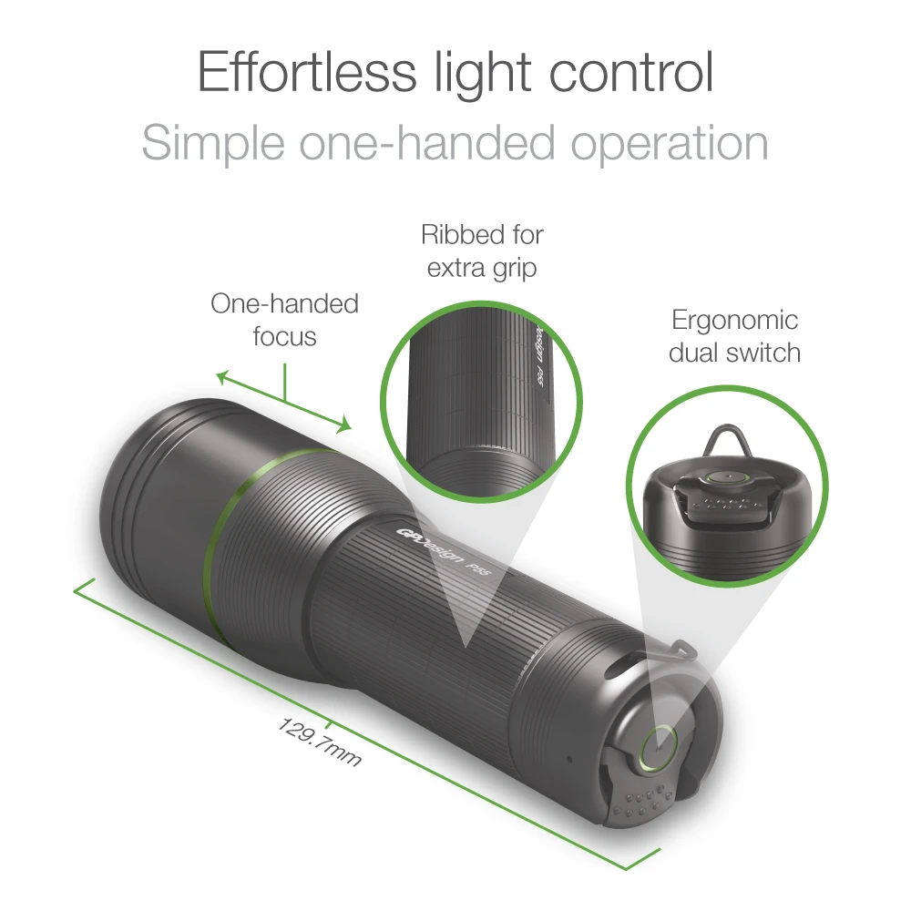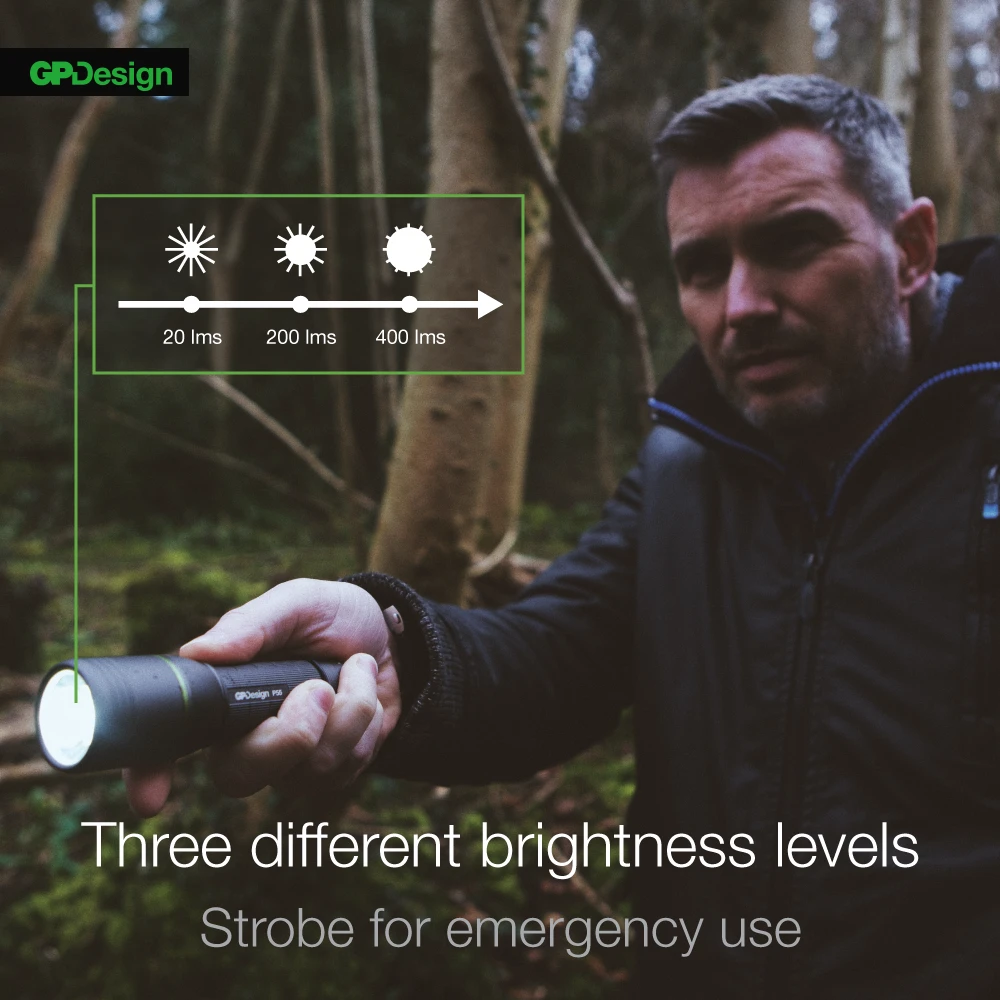 Pour ajuster la focalisation du faisceau, faire simplement glisser la tête de la lampe d’avant en arrière. La lampe est équipée d’une dragonne pratique qui fait aussi office de fonction antiroulement quand vous la posez à côté de vous. Sa forme stable permet à la lampe de tenir debout. C’est l’utilisateur qui est au cœur de la collection de lampes de poche GP Design. Grâce à leur fonctionnalité bien pensée et à leur haute qualité, ces lampes de poche sont conçues pour les activités quotidiennes, l’aventure et le travail qui exigent beaucoup en termes de performance et de durabilité de la source lumineuse. Toutes les lampes GP Design sont en aluminium anodisé de qualité aéronautique, ce qui les rend extrêmement solides, résistantes aux chocs et adaptées pour bien fonctionner dans de nombreuses situations différentes, même dans des environnements industriels et professionnels difficiles. Elles possèdent des propriétés de résistance aux fortes projections d’eau (IPX4), ce qui rend appropriée leur utilisation sous la pluie, mais pas immergées dans l’eau. À titre de sécurité supplémentaire, toutes les lampes ont une protection contre les inversions de polarité, qui empêche la lampe d’être endommagée si les piles sont mal installées ; les modèles rechargeables sont alimentés par des piles ion-lithium de qualité avec des fonctionnalités de sécurité intégrées pour protéger la batterie et la lampe contre la surchauffe et la surcharge.
