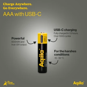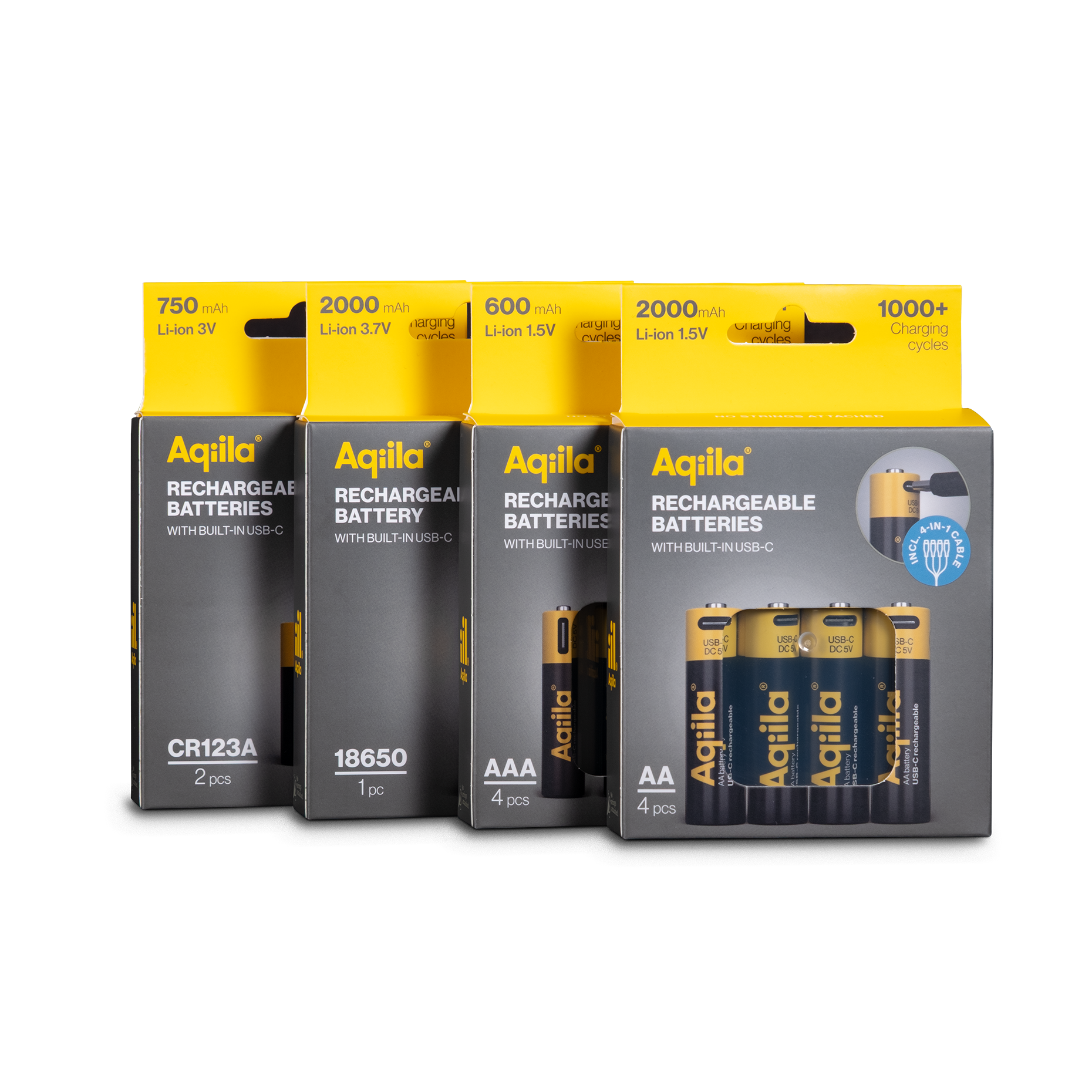 Le batterie ricaricabili USB-C di Aqiila garantiscono energia affidabile ovunque. Niente caricabatterie ingombranti, niente prese da cercare – collega semplicemente il cavo USB-C direttamente alla batteria e ricarica mentre sei in movimento. Le batterie resistono a oltre 1000 cicli di ricarica e offrono prestazioni stabili da -10 °C a +50 °C. La ricarica rapida garantisce che tu non rimanga mai senza energia. Che si tratti di torce frontali, GPS, fotocamere o radio, queste batterie assicurano un funzionamento senza interruzioni dalla giornata lavorativa al campeggio.Per dispositivi più piccoli che richiedono energia affidabile, le batterie AAA ricaricabili USB-C di Aqiila sono la soluzione perfetta. L'uscita reale da 1,5 V garantisce prestazioni stabili, mentre la porta USB-C integrata consente di ricaricare direttamente le batterie – nessun caricatore separato necessario. Ogni confezione da quattro batterie include un cavo di ricarica 4-in-1 e una custodia da viaggio, perfetta da mettere nello zaino. Completamente cariche in solo 1,5 ore e testate per oltre 1000 cicli di ricarica, sono la soluzione leggera e sempre pronta per l’energia in movimento.