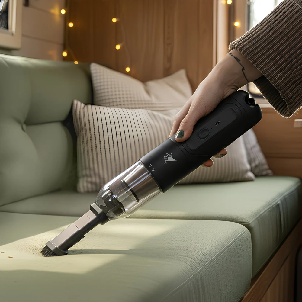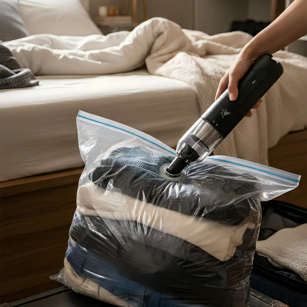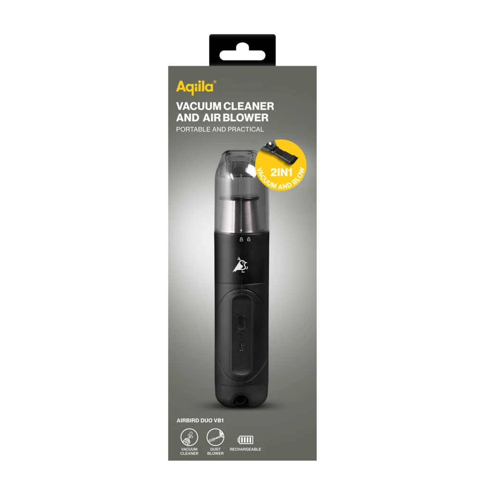 Airbird DUO fungerer både som en ministøvsuger og en luftblåser. Med støvsugerfunksjonen kan den også vakuumforsegle.