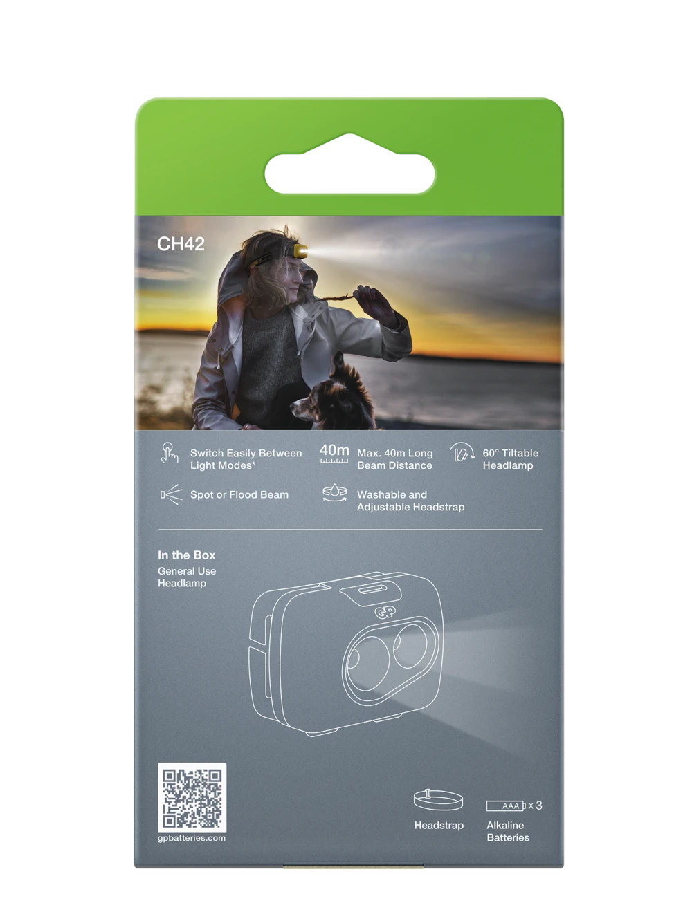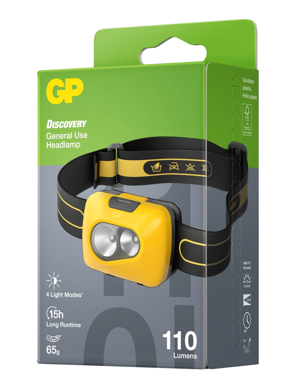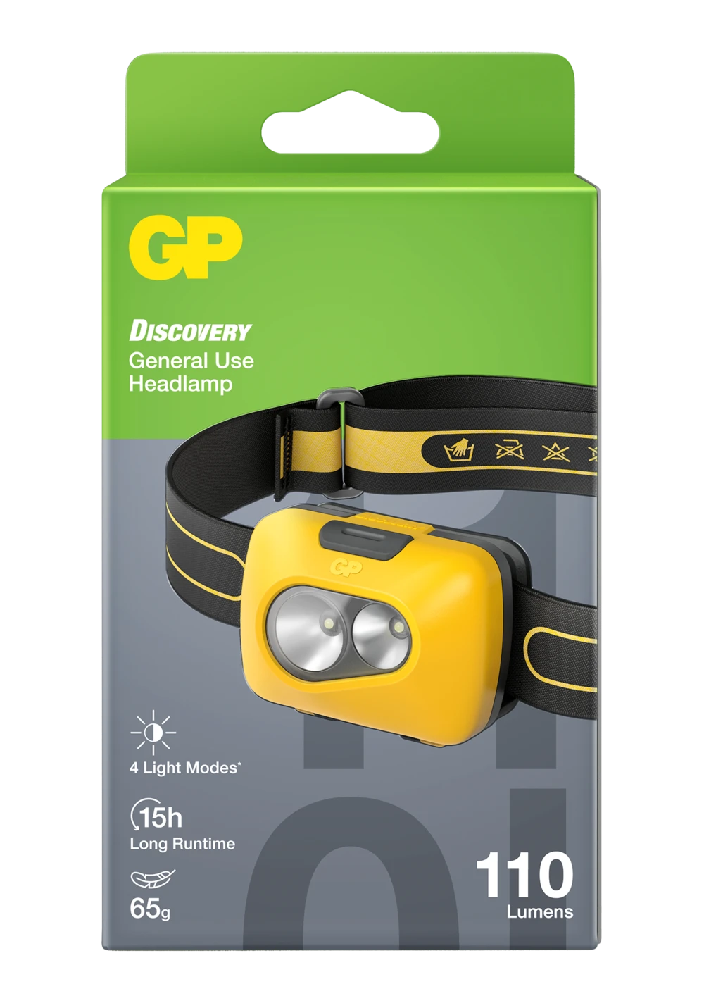 GP Discovery CH42 multifunksjonelle hodelykt er den perfekte allround-lampen. Utviklet for å gjøre gasshverdagen litt enklere og tryggere. Med en rekkevidde på 40 meter og opptil 110 lumen er GP Discovery CH42 den optimale hodelykten å ha for hånden rundt i hjemmet. Muligheten til å velge mellom 3 forskjellige lysstyrker og blinkende SOS-lys gjør det også en nødvendighet på utflukten eller hundeturen. Har en brukervennlig knapp for enkelt å veksle mellom de ulike funksjonene. Huset rundt lampen er robust og sprutsikkert og støtsikkert opp til en høyde på 1 meter. Det brede pannebåndet kan vaskes i maskin og er enkelt å justere for maksimal komfort. GP Discovery CH42 hodelykt er en alt-i-ett-lampe som er et must i enhver husholdning.