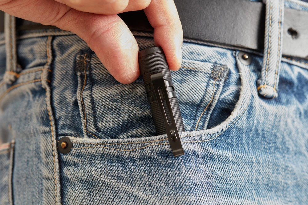En liten og kompakt lommelykt med hus i slitesterk, anodisert aluminium. En enkel trykknapp i enden skrur lykten på og av og metallklipsen i siden gjør det enkelt å feste den til klær osv.