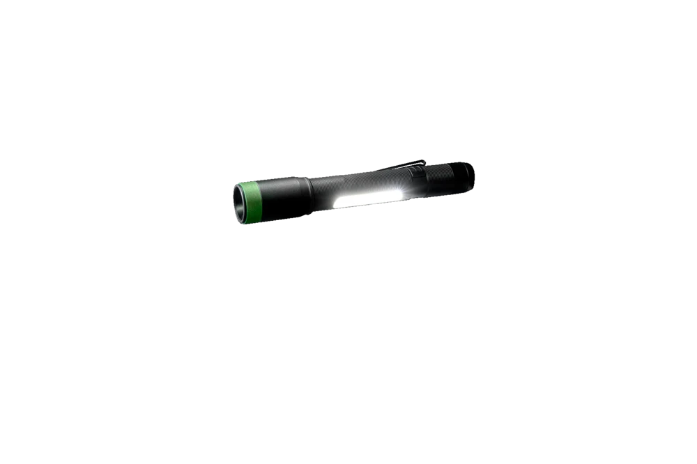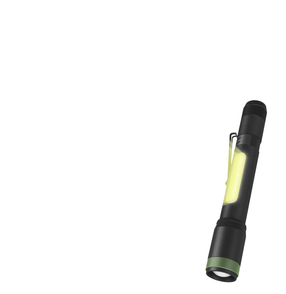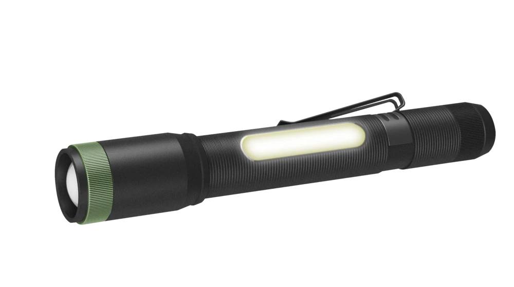 Middels kraftig arbeidslommelykt med to lyskilder: i kortenden og på langsiden. Variabelt lommelyktlys. Lese- og arbeidslys på langsiden. Magnetfeste i kortenden.