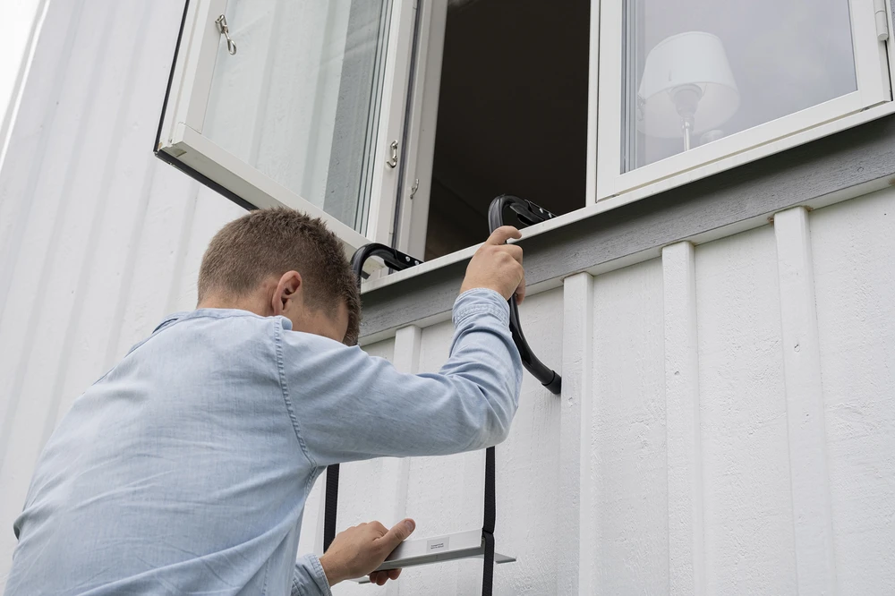 Housegard brannstige er enkel å oppbevare og bruke. Oppbevares lett tilgjengelig i et skap eller under sengen for å kunne tas frem ved behov. Housegard brannstige er utstyrt med kraftige kroker som henges over vinduskarmen ved evakuering.