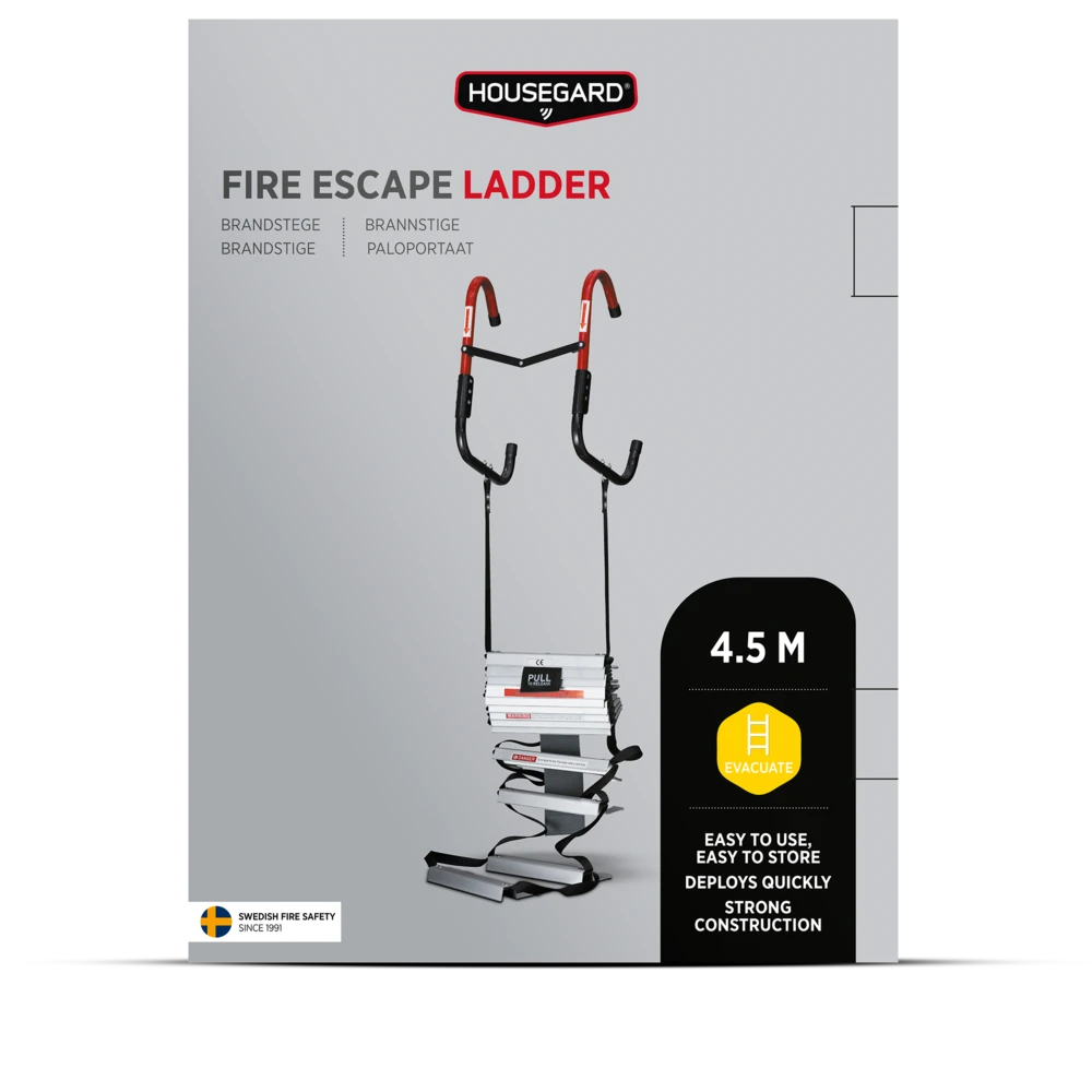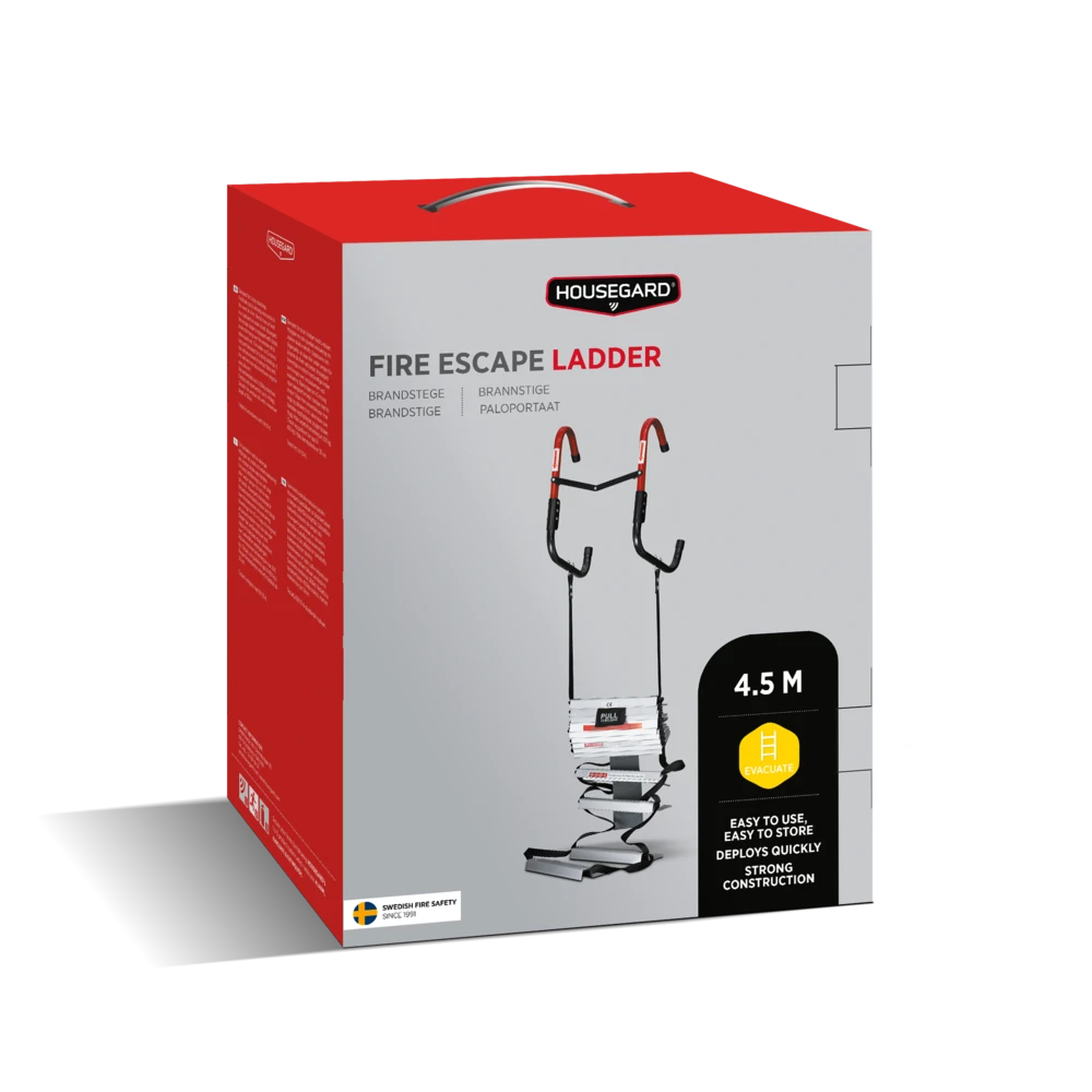 Housegards brannstige er både smidig å dra ut, og tar liten plass når den ikke brukes. Oppbevares lett tilgjengelig, enten i et skap eller under sengen. Husk også å ta den ut av emballasjen for å spare tid ved en eventuell evakuering.