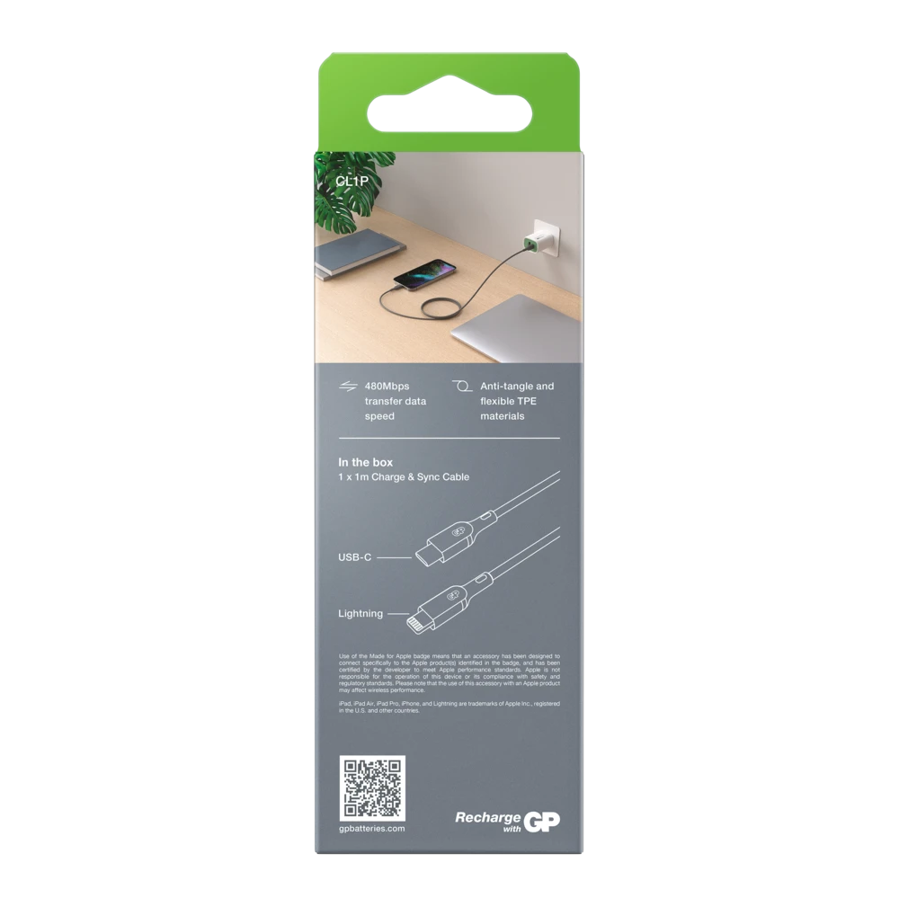 GP Essential USB-kabel CL1P, USB-C til Apple Lightning (MFi), 1 m