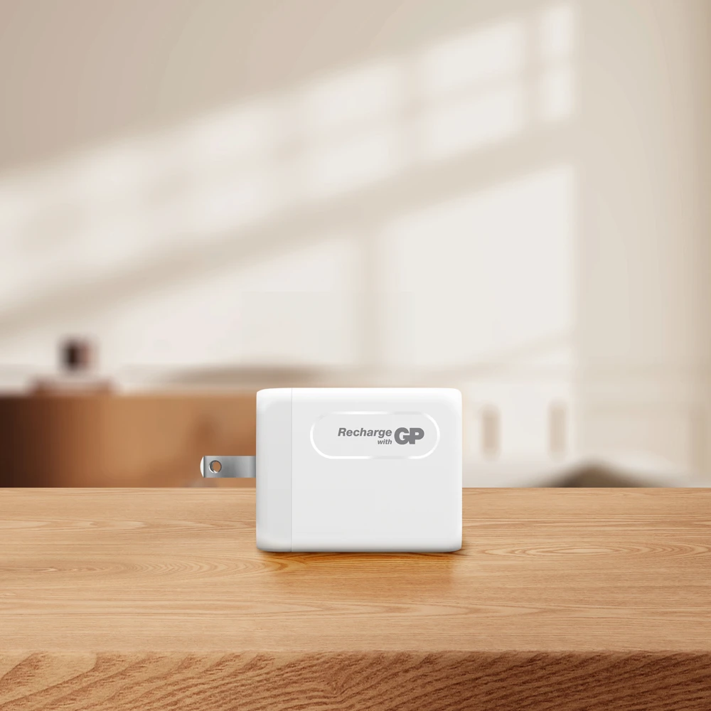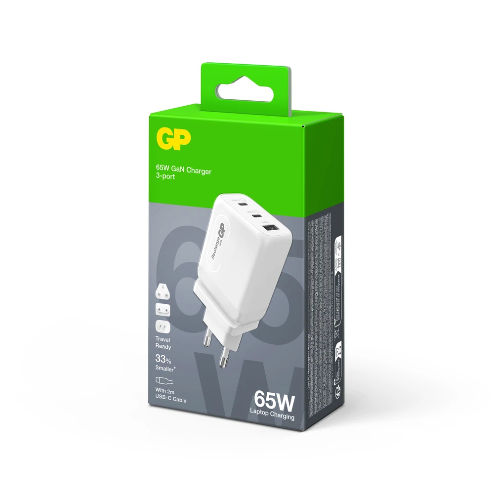 Med GP GaN PD 65W vegglader kan du fullade den bærbare datamaskinen på bare ca. 1,5 timer. Veggladeren kan lade en rekke tekniske dingser som mobiltelefoner, spillkontrollere og nettbrett. Den er mindre enn andre tradisjonelle ladere (61 W-ladere fra andre ledende merker), noe som betyr at den er svært praktisk å ta med seg på reise. Til tross for størrelsen genererer veggladeren hele 65 W strøm.Den leveres også med ekstra adaptere, slik at du raskt og enkelt kan lade dingsene dine uansett hvor du befinner deg i verden. Denne praktiske nyvinningen kan lade opptil tre enheter via USB-C og USB-A.