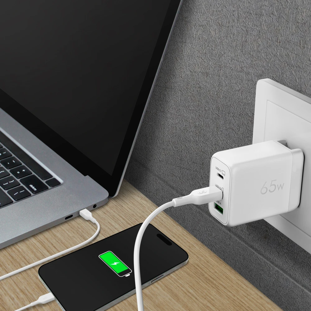 Lader tre enheter samtidig – GPs vegglader lader opptil tre enheter samtidig. Med 2 USB-C-innganger og 1 USB-A-inngang kan du enkelt lade mobiltelefonen, den bærbare datamaskinen eller spillkontrolleren.