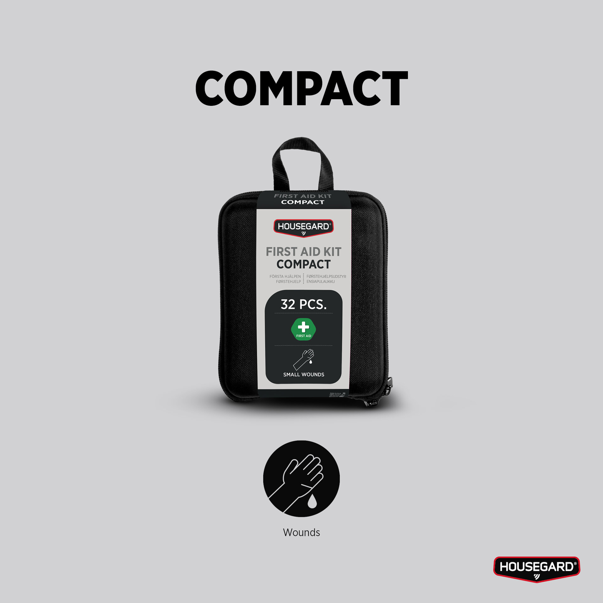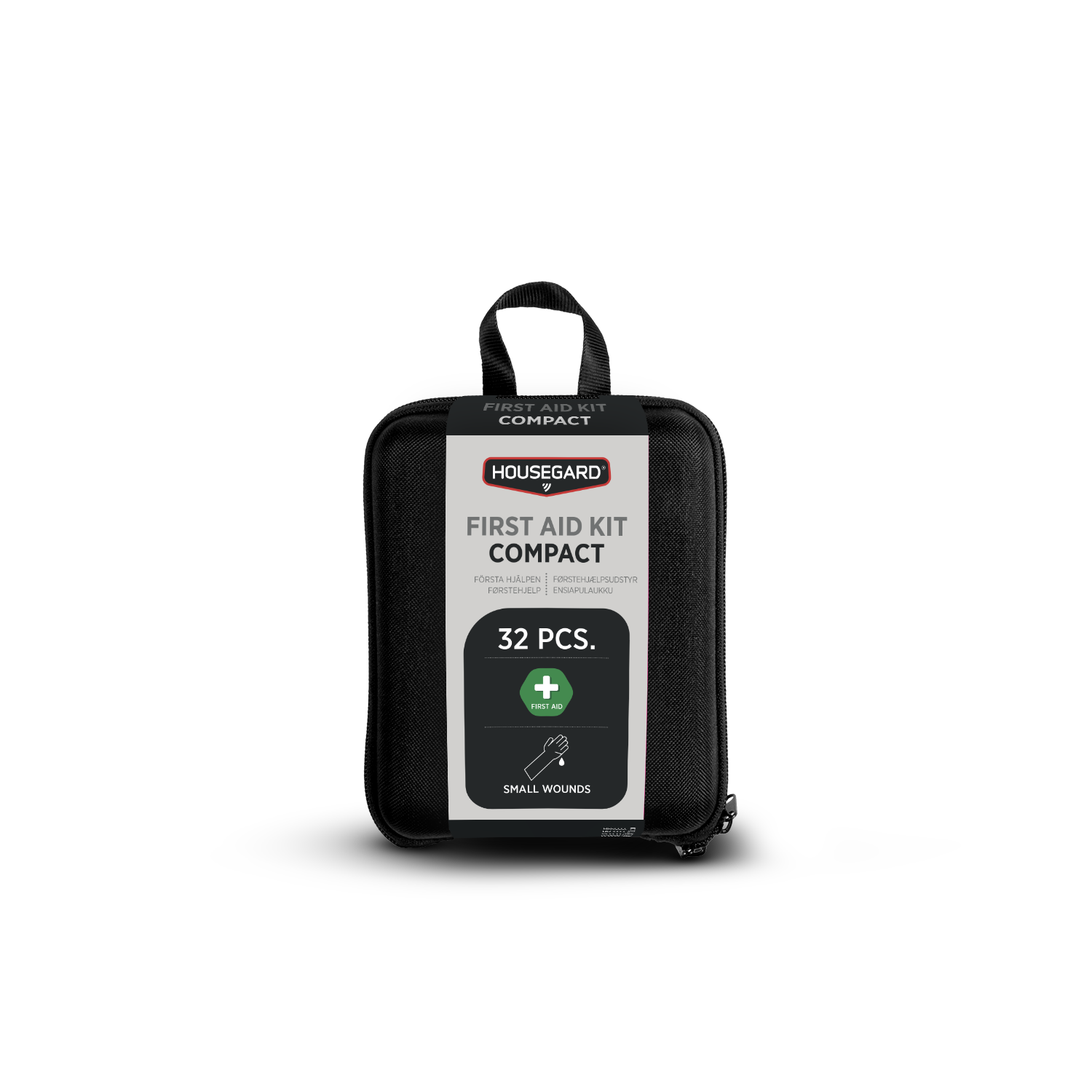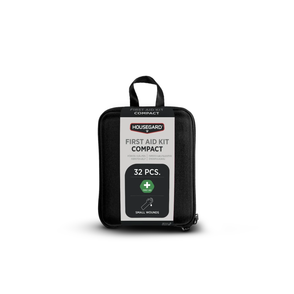 Housegard Compact er en kompakt og praktisk førstehjelpsveske som inneholder det viktigste for å håndtere små sår og skader. Perfekt for hjemmet, bilen eller på tur.