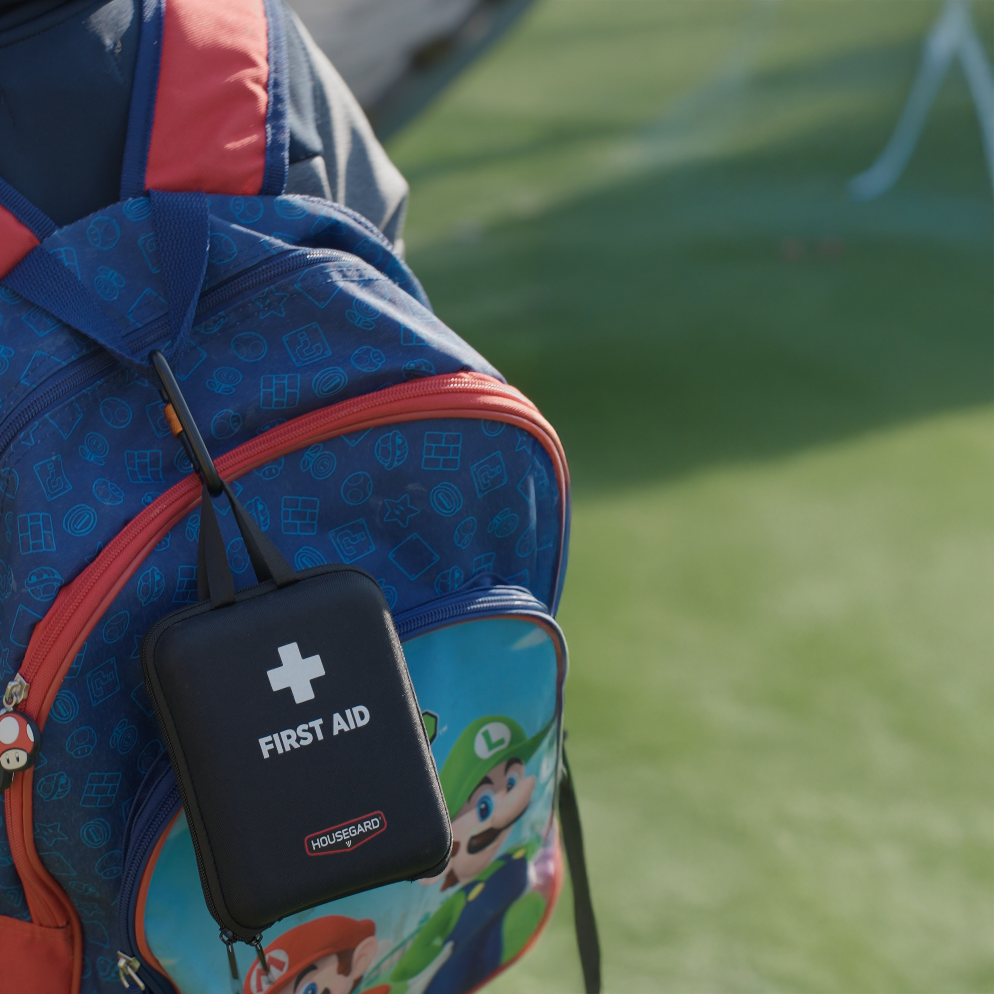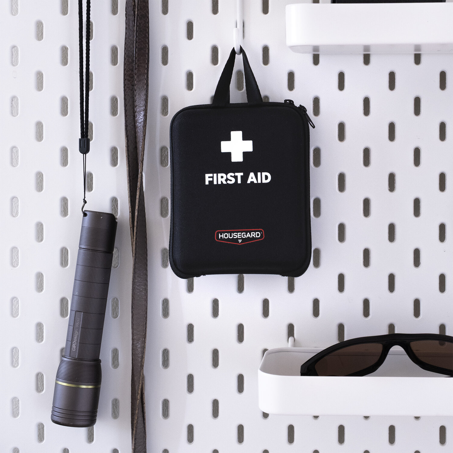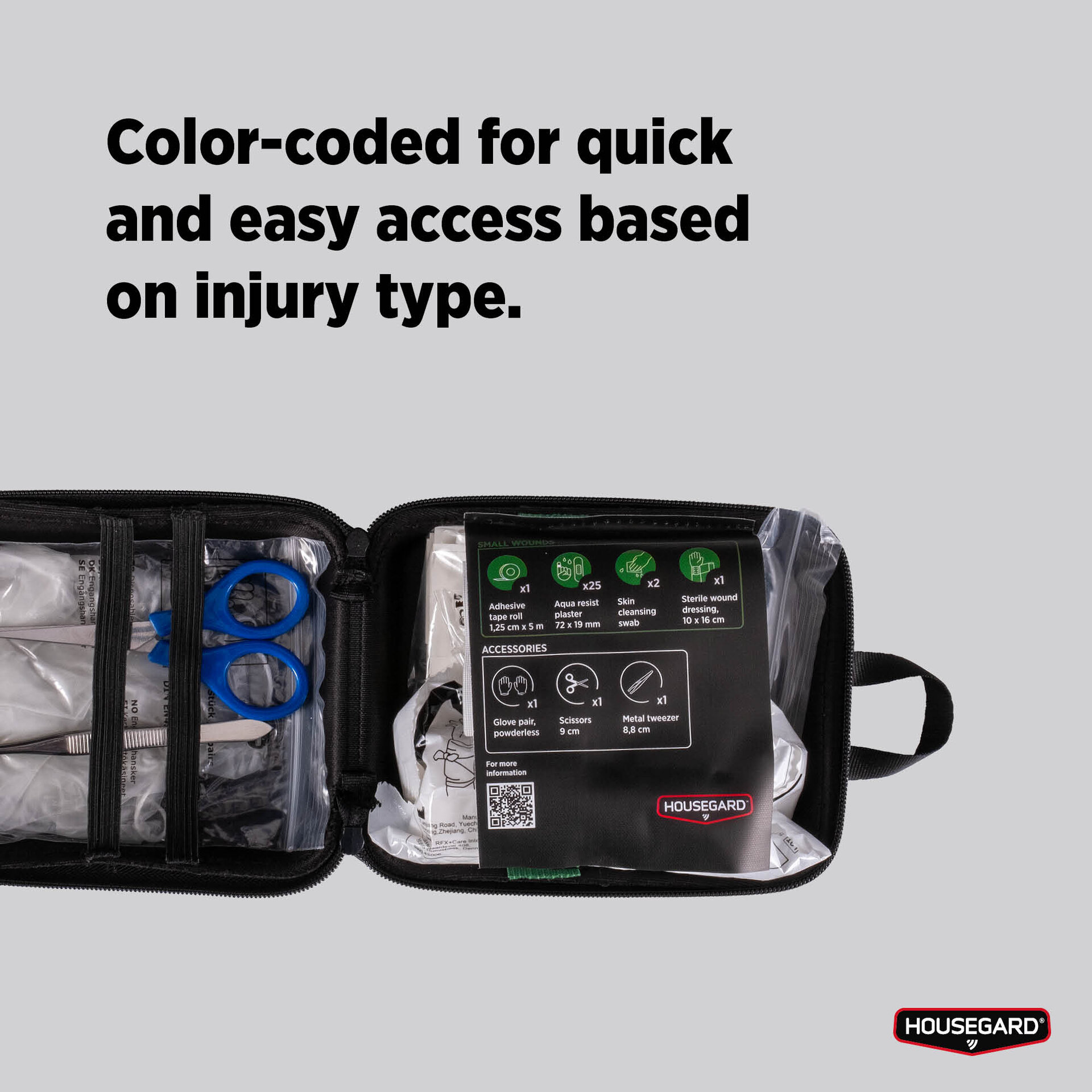 Housegard Compact er en kompakt og praktisk førstehjelpsveske som inneholder det viktigste for å håndtere små sår og skader. Perfekt for hjemmet, bilen eller på tur.