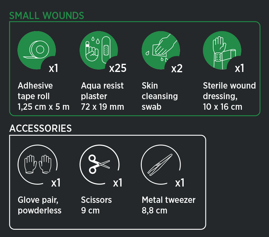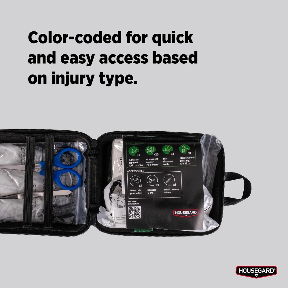 Housegard Compact er din perfekte følgesvenn i hjemmet, bilen eller på reisen. Vesken er liten og lett, men inneholder likevel det viktigste for å behandle små sår og mindre skader. Den robuste designen gjør den enkel å oppbevare og ta med, uansett hvor du skal. Vesken er utviklet med fokus på enkelhet og rask tilgang til riktig utstyr. Den inkluderer også hansker og andre nødvendige tilbehør for trygg behandling.