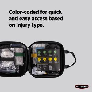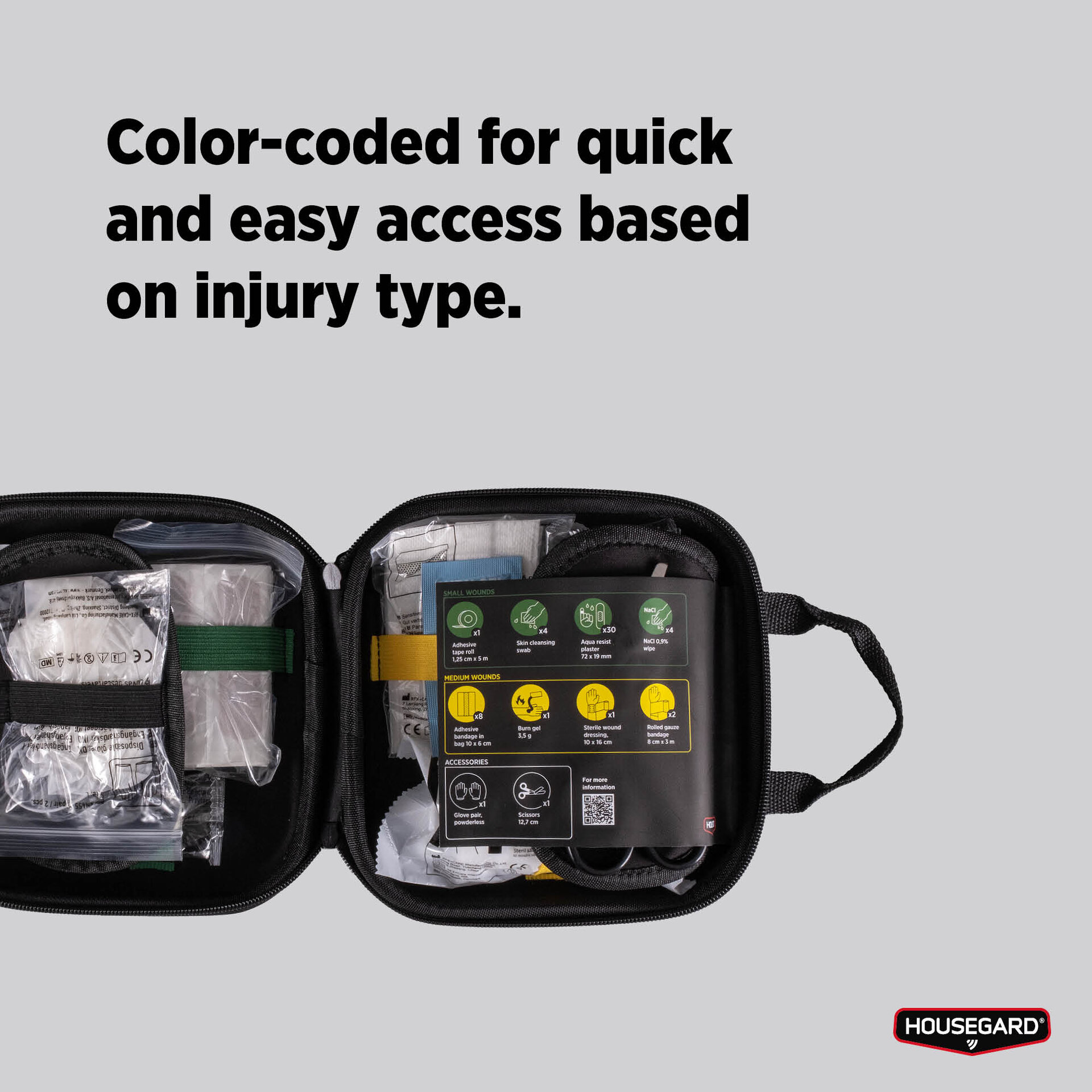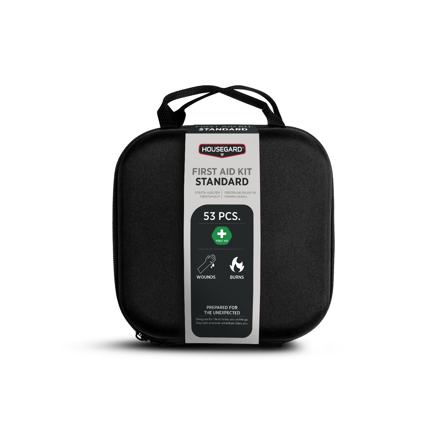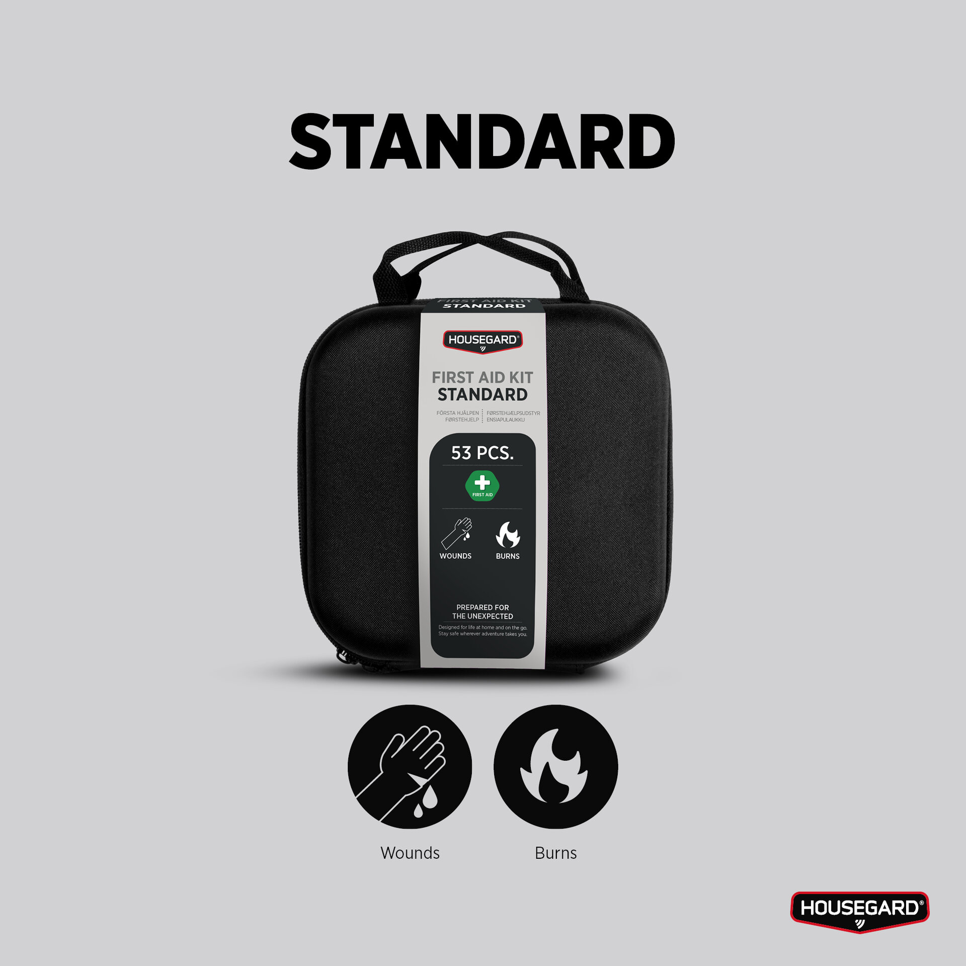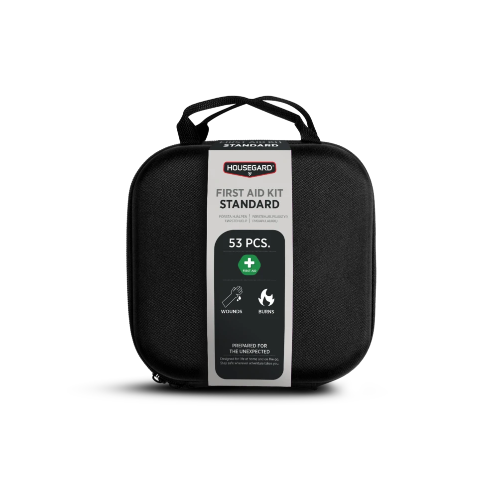 Housegard Standard er en allsidig førstehjelpsveske med 53 deler for å håndtere både små og middels store sårskader. Perfekt for hjemmet, bilen eller fritidsaktiviteter.
