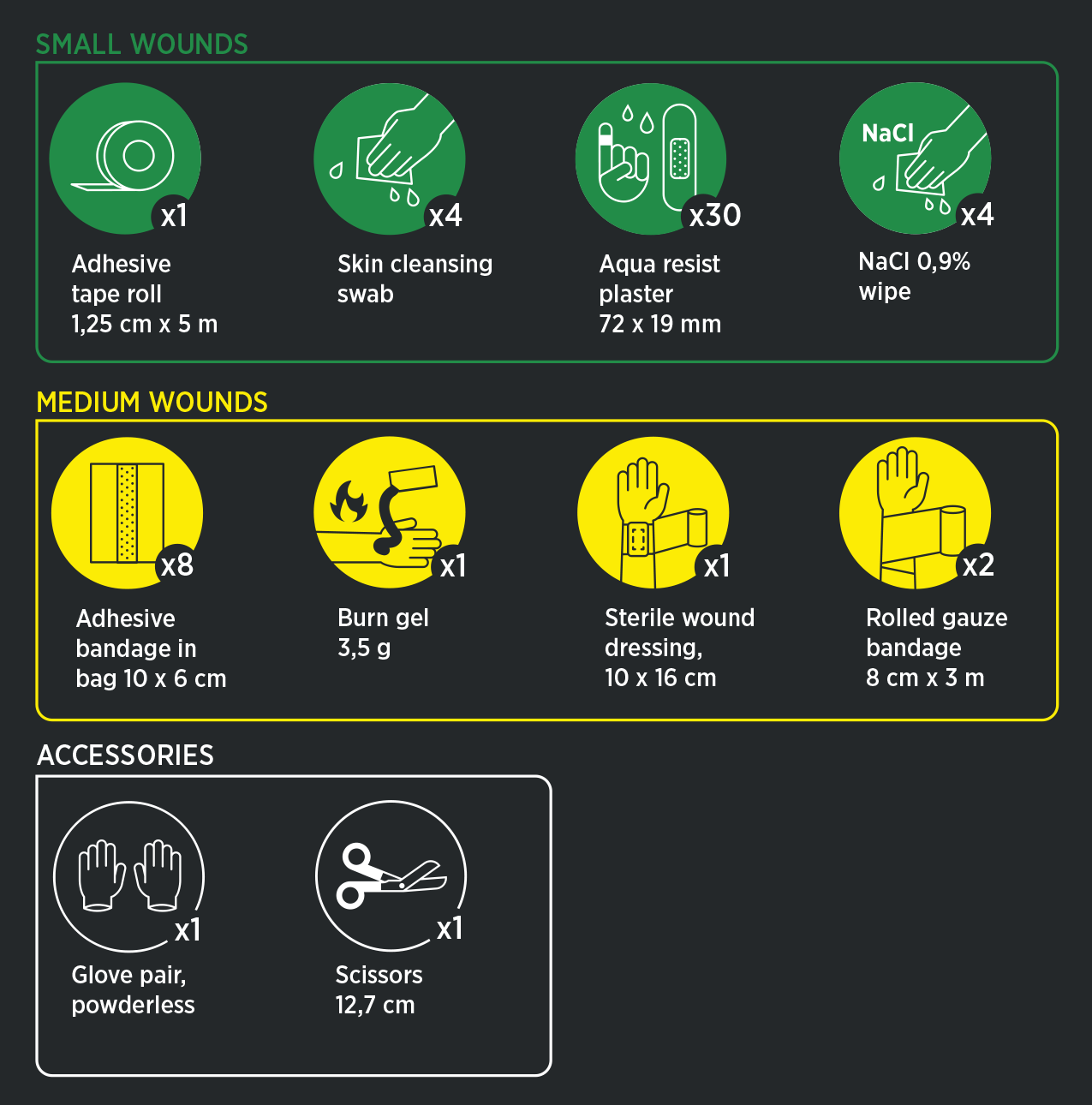 Vesken er kompakt, men rommer alt du trenger for raskt å kunne håndtere sår, brannskader og blødninger. Den holdbare designen og de tydelige lommene gjør det enkelt å finne riktig utstyr raskt i en nødsituasjon.