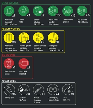 Med 89 deler dekker vesken grunnleggende behov for raskt å kunne gi førstehjelp i nødsituasjoner. Munn-til-munn maske og redningsteppe gjør den spesielt nyttig ved større ulykker, og du kan være trygg på at alle bandasjer, kompresser og utstyr holder seg tørre og effektive.