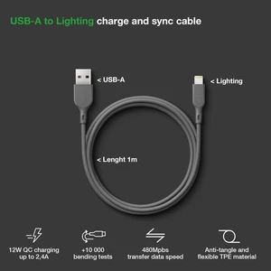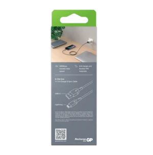 Charge & Sync-kabeln från GP är den perfekta kabeln för daglig användning. Kabeln är tillverkad av böjligt material som gör att den kan sträckas och böjas över 10 000 gånger utan att gå av. Den är MFi-certifierad och har en maximal uteffekt på 12 W vilket gör den perfekt för Apple-produkter. Kabeln kan användas för 480 Mbps höghastighetsöverföring av alla filtyper så att data kan överföras blixtsnabbt.
